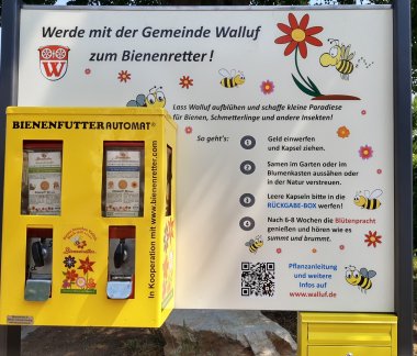 Mit dem bunten Schild ist der Wallufer Bienenfutterautomat an der Rheinanlage kaum zu übersehen. Der knallgelbe Apparat mit den Blumensamen – dem Bienenfutter – steht direkt an der E-Bike-Ladestation und der Pizza-Box und lässt nicht nur Kinderherzen höherschlagen. Die ältere Generation wird in ihm sicherlich noch den Kaugummiautomaten „von früher“ erkennen,..