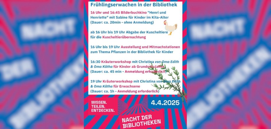 Das Angebot zur Nacht der Bibliotheken am 4. April in der Wallufer Schiffchenbibliothek reicht von Bilderbuchkino bis hin zu Kräuterworkshops. Bei den diversen Aktionen für unterschiedlichste Altersklassen stehen Frühling und Pflanzen sowie Wissen, Teilen und Entdecken im Focus. Auch bei der Kuscheltierübernachtung: Was die Übernachtungsgäste in der Bücherei alles erleben und entdecken, wird auf Bildern festgehalten.