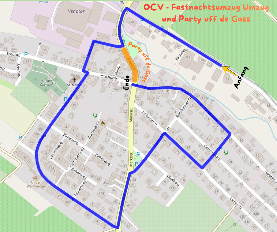 Am Fastnachtssonntag, 15.02.2026, schlängelt sich der närrische Fastnachtsumzug wieder durch Oberwalluf – die Umzugsstrecke ist im Plan blau markiert. Daher kommt es zu kurzzeitigen Verkehrsbeschränkungen. Eine Umleitung wird ausgeschildert.