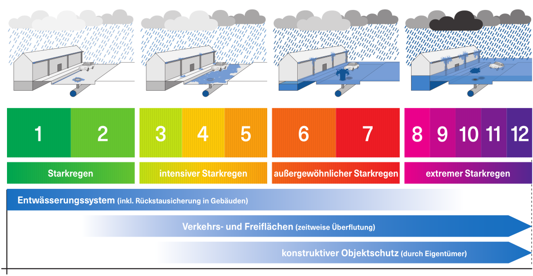 Im Zuge der globalen Klimaveränderung nimmt auch in unseren Gegenden die durchschnittliche Jahrestemperatur zu. Damit geht eine Häufung von Extremwetterlagen einher. Bei kurzen, aber sehr kräftigen Niederschlägen, sogenannten Starkregen, müssen große Wassermassen oberirdisch abfließen, wenn sie nicht mehr vollständig vom Kanalnetz oder angrenzenden Gewässern aufgenommen werden können. Solche Ereignisse, zum Beispiel während eines sommerlichen Gewitters, betreffen oft nur wenige Quadratkilometer.