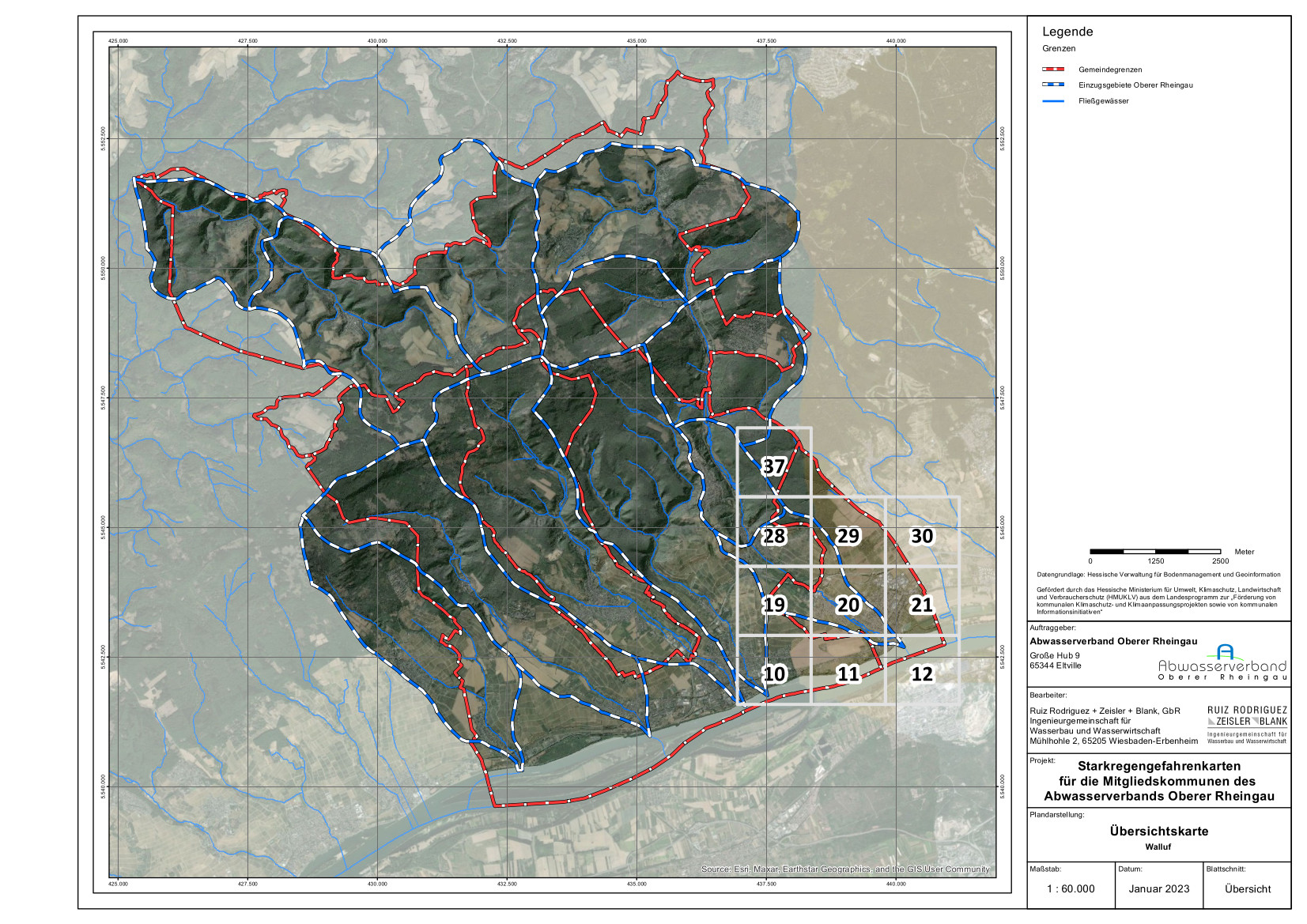 Die Starkregengefahrenkarten und die Risikokarten für die Gemeinde Walluf stehen Ihnen auf unserer Homepage zum Download zur Verfügung. Den für Sie relevanten Bereich können Sie über die Übersichtskarte Walluf auswählen.