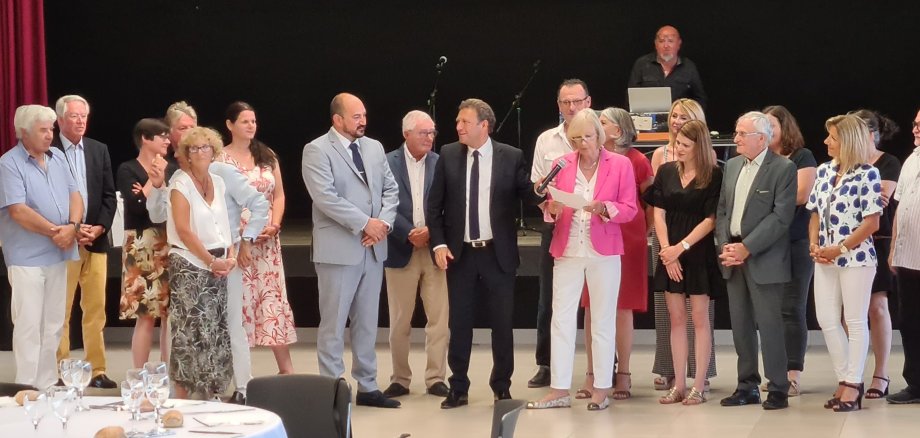 Die Wallufer Delegation während des Festaktes im Salle de Fêtes (von links): Hannelore Hennrich (nicht im Bild) , Alexander Hennrich, Frank Edgar Portz, Ulrike Hans und Dr. Michael Müller, Iris Pucci, Kerstin Strödel und Wallufs Bürgermeister Nikolaos Stavridis, Günter Dietz, La Londes Bürgermeister François de Canson, Christine Portz, Norbert Schneider. Nicht im Bild: Dr. Heidrun Orth-Krollmann und Helge Krollmann, Monika Dietz und Christine Klotzbach-Schneider