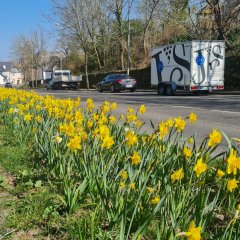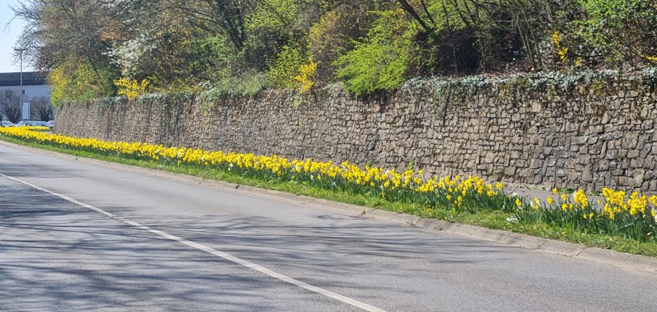 Im Augenblick überwiegt die Farbe Gelb, die sogenannte Osterglocke. Doch hin und wieder spitzt auch etwas Weiß durch. „Dies ist erst der Anfang“, so Bürgermeister Nikolaos Stavridis, „die über 17.000 Blumenzwiebeln, die hier im vergangenen Herbst mit einer speziellen Pflanzmaschine in den Boden gesetzt wurden, verwandeln das sogenannte Straßenbegleitgrün bis zu vier Monate lang in ein Straßenbegleitblütenmeer.“ Und das über mehrere Jahre hinweg, immer zu Frühlingsbeginn. Jetzt stehen Überlegungen an, weitere Flächen in ähnlicher Weise farbenfroh zu gestalten.