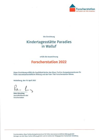 „Mit der Plakette zeigen wir, dass wir die frühe naturwissenschaftliche Bildung erfolgreich in unseren pädagogischen Alltag einbinden“, erläutert Mónica Hernández, Leiterin der Kita Paradies in Walluf. „Wir sind sehr stolz darauf, diese Auszeichnung zum dritten Mal in Folge erhalten zu haben.“ Pandemiebedingt konnten 2020 und 2021 keine Fortbildungen wahrgenommen und keine Plaketten verliehen werden.