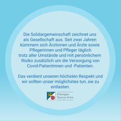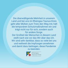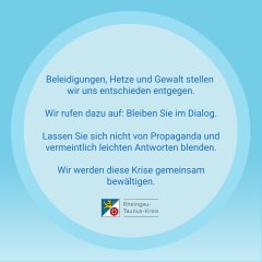 Im Rheingau-Taunus-Kreis möchten Landrat und Bürgermeister gemeinsam ein Zeichen gegen die sogenannten Montagsspaziergänge setzen, in denen unangemeldet gegen "autoritäre Corona-Maßnahmen" und für demokratische Grundrechte demonstriert wird. Selbstverständlich macht es unsere Demokratie aus, dass Kritik an Politik und Staat jederzeit öffentlich möglich ist, doch das bewusste Verletzen von Gesetzen - so der gemeinsame Konsens - ist nicht zu tolerieren: Das Grundrecht auf Meinungsfreiheit endet dort, wo das Grundrecht auf die Würde eines anderen verletzt wird. Beleidigungen, Hetze und Gewalt stellen sich die Gemeindevorsteher im Rheingau-Taunus-Kreis entschieden entgegen.