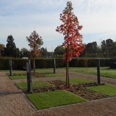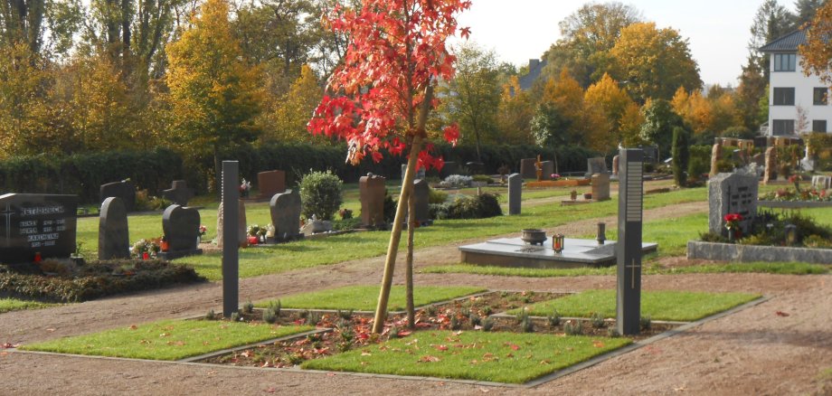 Die beiden neuen Grabfelder befinden sich östlich der Trauerhalle, unterhalb der Kolumbarien-Anlage mit ihren Rundstelen und haben eine quadratische Grundfläche von jeweils 5 x 5 Metern. Jedes Grabfeld ist mit einem ein Meter breiten und kreuzförmig angelegten Pflanzstreifen in vier kleinere Rasenfelder unterteilt, die mit jeweils 16 Urnengräbern belegt werden können. In der Mitte wächst ein Amber-Baum, die Pflanzstreifen sind der Jahreszeit entsprechend angelegt. Und da ein Gemeinschaftsgrabfeld keineswegs anonym sein soll, stehen jeweils zwei Stelen zur Verfügung, auf denen die Namen und Lebensdaten der dort beigesetzten Personen angebracht werden können. Ebenfalls neu angelegte Splittwege verbinden die Grabfelder miteinander und binden diese harmonisch ins Gesamtbild des Friedhofs ein.