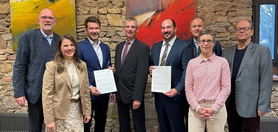 Die Übergabe des Bewilligungsbescheids fand am 5. Dezember 2022 im Haus der Region in Oestrich-Winkel statt. Das Bild zeigt Bürgermeister Nikolaos Stavridis in der Bildmitte (Fünfter von links) mit dem Bescheid im Rahmen der Übergabeveranstaltung.
