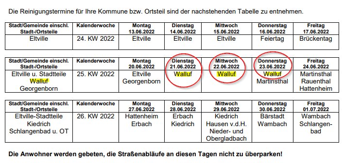 Die Reinigungstermine für die Gemeinde Walluf (Sinkkastenreinigung 2022, 1. Reinigungsgang) können Sie dem hier hinterlegten PDF entnehmen: Reinigungsplan_Sinkkastenreinigung-2022_1.pdf