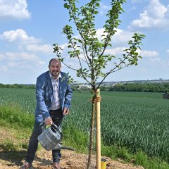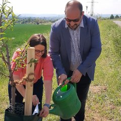 Insgesamt fördert die Stiftung Nachhaltiger Rheingau das Projekt mit 2.600 €, was gut einem Drittel der Gesamtkosten entspricht, und stellt zusätzlich zu ihrem finanziellen Engagement die 30 nachhaltigen Bewässerungssäcke zur Verfügung. Um das Projekt finanziell zu stemmen, hat die Gemeinde Walluf noch einen weiteren Sponsor an Bord geholt, der ebenfalls rund ein Drittel der Maßnahme übernimmt. Die restlichen Aufwendungen für die Errichtung und den Unterhalt der Obstbaumallee stammen aus gemeindeeigenen Mitteln. „Wir möchten mit diesen Obstbäumen einen Beitrag zum Umwelt- und Naturschutz leisten“, äußert sich Bürgermeister Nikolaos Stavridis zu dem Projekt. „Die blütenreichen Bäume locken Bienen und andere Insekten an, die als Bestäuber auch den umliegenden Feldern zugutekommen. Darüber hinaus stellen die Bäume für das angrenzende Feld einen Erosionsschutz dar, bieten Vögeln und anderen Kleintieren einen Nahrungs- und Rückzugsort und sind für alle, die vorbeikommen, eine Augenfreude und Schattenspender.“
