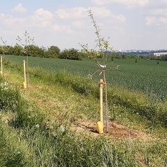 Die Pflege der Obstbäume, die Anfang Mai durch ein Baumschulunternehmen gepflanzt werden – am Montag, 02. Mai 2022 wird die Pflanzfläche durch die Baumschule vorbereitet, drei Tage später, am Donnerstag, 05. Mai 2022, werden die 30 Obsthalbstämme gesetzt –, übernimmt der gemeindeeigene Baubetriebshof. Um dem Bauhofteam die Bewässerung der Obstreihe insbesondere in der Anwachszeit zu erleichtern, werden alle 30 etwa 1,20 Meter hohen Obstgehölze mit nachhaltigen Baumbewässerungssäcken der Stiftung Nachhaltiger Rheingau versehen. Zusätzlich helfen an diesem sonnenreichen Standort Drainagen dabei, die Bäume mit ausreichend Wasser zu versorgen. Baumschützer aus Draht, sogenannte Drahthosen, sollen die frisch gepflanzten Obststämme vor Wildfraß, speziell durch Wildschweine, bewahren.