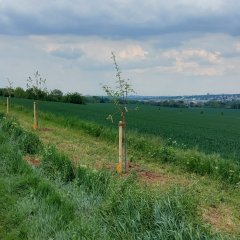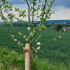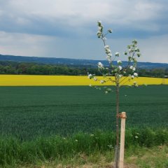 Bei den 30 Bäumen, die das Bauamt der Gemeinde Walluf zusammen mit der Stiftung Nachhaltiger Rheingau für den Blühstreifen ausgewählt hat, handelt es sich um sogenannte Halbstämme in heimischen, hellen Obstsorten, darunter Apfel und Birne. Die kleinere, Halbstamm genannte Züchtung nimmt weniger Raum in Anspruch als ein hochstämmiger Obstbaum und ist dank der geringeren Höhe leichter abzuernten. Dabei liefert sie einen erstaunlich hohen Ertrag. Die Raumersparnis war ein ausschlaggebendes Kriterium für die Pflanzung am Feldrand, da die Breite des Blühstreifens begrenzt ist und die Baumkronen, die hier den ganzen Tag über Sonne tanken können, einen vergleichsweise geringeren Bereich des Ackers beschatten. Die gesamte Wallufer Obstbaumallee entlang des Feldwegs nach Eltville misst rund 300 x 5 Meter.