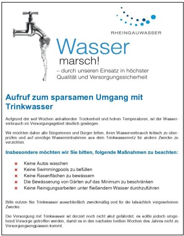 Die Versorgung mit Trinkwasser ist derzeit noch nicht akut gefährdet, es sollte jedoch umgehend Vorsorge getroffen werden, damit es in den nächsten heißen Wochen des Jahres nicht zu Versorgungsengpässen kommt. Die Rheingauwasser GmbH weist aktuell darauf hin, dass Trinkwasser ausschließlich für die tatsächlich vorgesehenen Zwecke genutzt werden sollte.