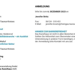 Um Anmeldung bis zum 6. Dezember an Frau Jennifer Brötz, Rheingau-Taunus-Kreis - Tel. 06124 510-451 oder per E-Mail Jennifer.Broetz@rheingau-taunus.de - wird gebeten.