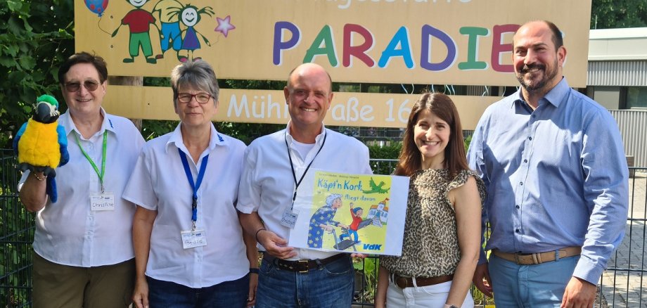 Die Kinder und eine Erzieherin lauschten den interessanten kleinen Abenteuern von Tante Irma, ihrem Neffen Ben und des Papageien Käpt’n Kork, der die günstige Gelegenheit eines offenen Fensters in der Wohnung von Tante Irma nutzt, um davonzufliegen und die Stadt zu erkunden. Die Kinder hatten viel Spaß, waren sehr interessiert und wussten zum Thema Barrieren und Barrierefreiheit schon einiges zu sagen. Am Ende der Vorstellung gab es für die Kinder noch kleine Geschenke einschließlich des Büchleins „Käpt’n Kork fliegt davon“.