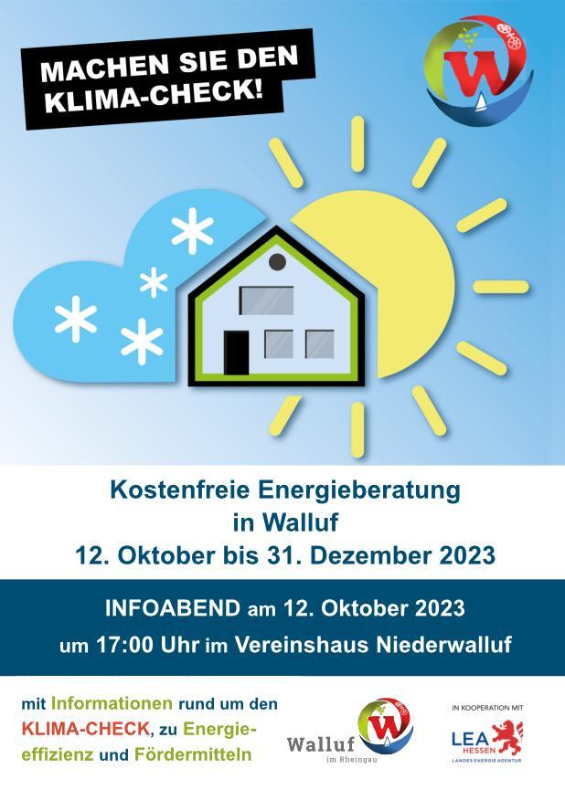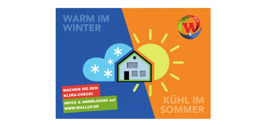 Warm im Winter und kühl im Sommer – jeder möchte ein behagliches Zuhause. Wie dies, gerade bei älteren Gebäuden, erreicht werden kann, zeigt die Kampagne „Aufsuchende Energieberatung“ mit ihrem KLIMA-CHECK: Bei einem rund einstündigen Termin werden Immobilienbesitzende durch eine qualifizierte Energieeffizienz-Expertin bzw. Energieeffizienz-Experten individuell zum baulichen Wärmeschutz, der Heizungstechnik und den Einsatzmöglichkeiten erneuerbarer Energien in den eigenen vier Wänden beraten. Im Anschluss gibt es ein Beratungsprotokoll mit Handlungsempfehlungen und Infos zu den möglichen nächsten Schritten. Die individuelle Erstberatung ist anbieter- und produktneutral und für Bürgerinnen und Bürger, die in der Gemeinde Walluf ein Ein‑ oder Mehrfamilienhaus besitzen und sich zur Aktion KLIMA-CHECK anmelden, kostenfrei und unverbindlich.