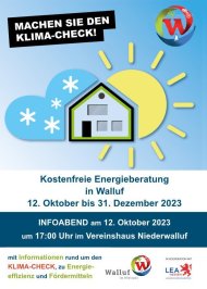 Die Anmeldung zum Infoabend am 12. Oktober ist dabei unabhängig vom KLIMA-CHECK in den eigenen vier Wänden: Hierzu können sowohl während der Auftaktveranstaltung im Vereinshaus Niederwalluf als auch über das Kontaktformular auf www.walluf.de/rathaus-politik/service/energieberatung Termine für den Zeitraum 12. Oktober bis 31. Dezember 2023 mit den beauftragten Energieeffizienz-Expertinnen und Experten individuell vereinbart werden.