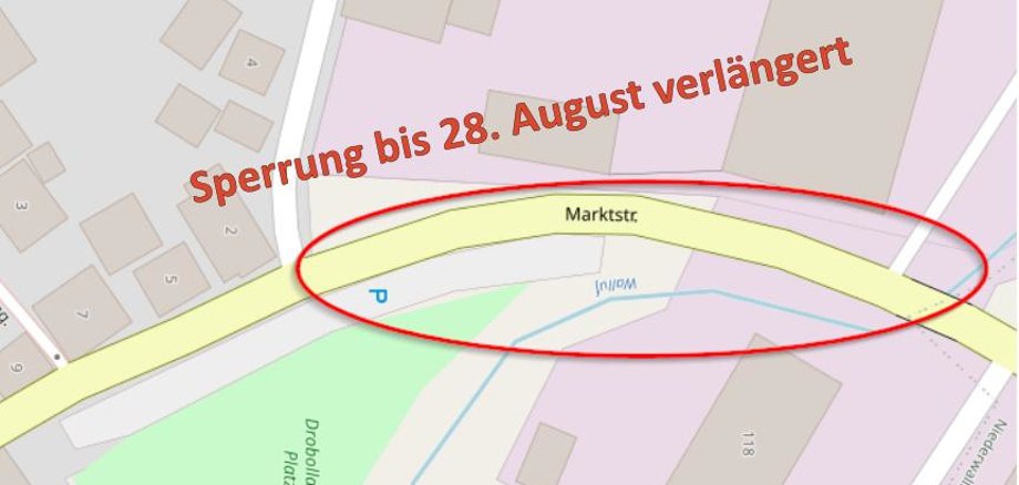 Da die Baumaßnahme wider Erwarten nicht bis heute, Freitag, 25. August 2023 abgeschlossen werden konnte, bleibt die Vollsperrung noch bis Montag, 28. August 2023 bestehen. Die ausführende Firma hat zugesichert, die Bauarbeiten am Montag fertigzustellen. Wir bitten um Beachtung und entschuldigen uns für die ungeplante Verlängerung der Sperrung sowie die damit verbundenen Unannehmlichkeiten.