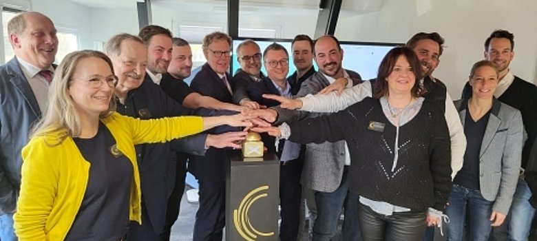 Bürgermeister Nikolaos Stavridis beim Start von Rheingau Connect und Taunus Connect mit Vertreterinnen und Vertretern der Gründungskommunen und -unternehmen im Gründerzentrum OG2 in Taunusstein (Foto © Stadt Taunusstein)