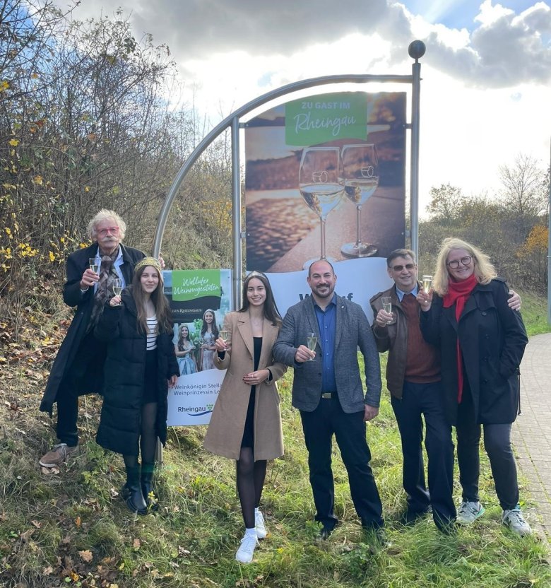 Weinkönigin Stella I. und Weinprinzessin Lea I. zusammen mit Bürgermeister Stavridis sowie Vertretern des Wallufer Weibauverbands (Hajo Becker, Wilhelm Markloff, Alexandra Russler) bei der Einweihung des neuen Schildes am Ortseingang Schachtweg.