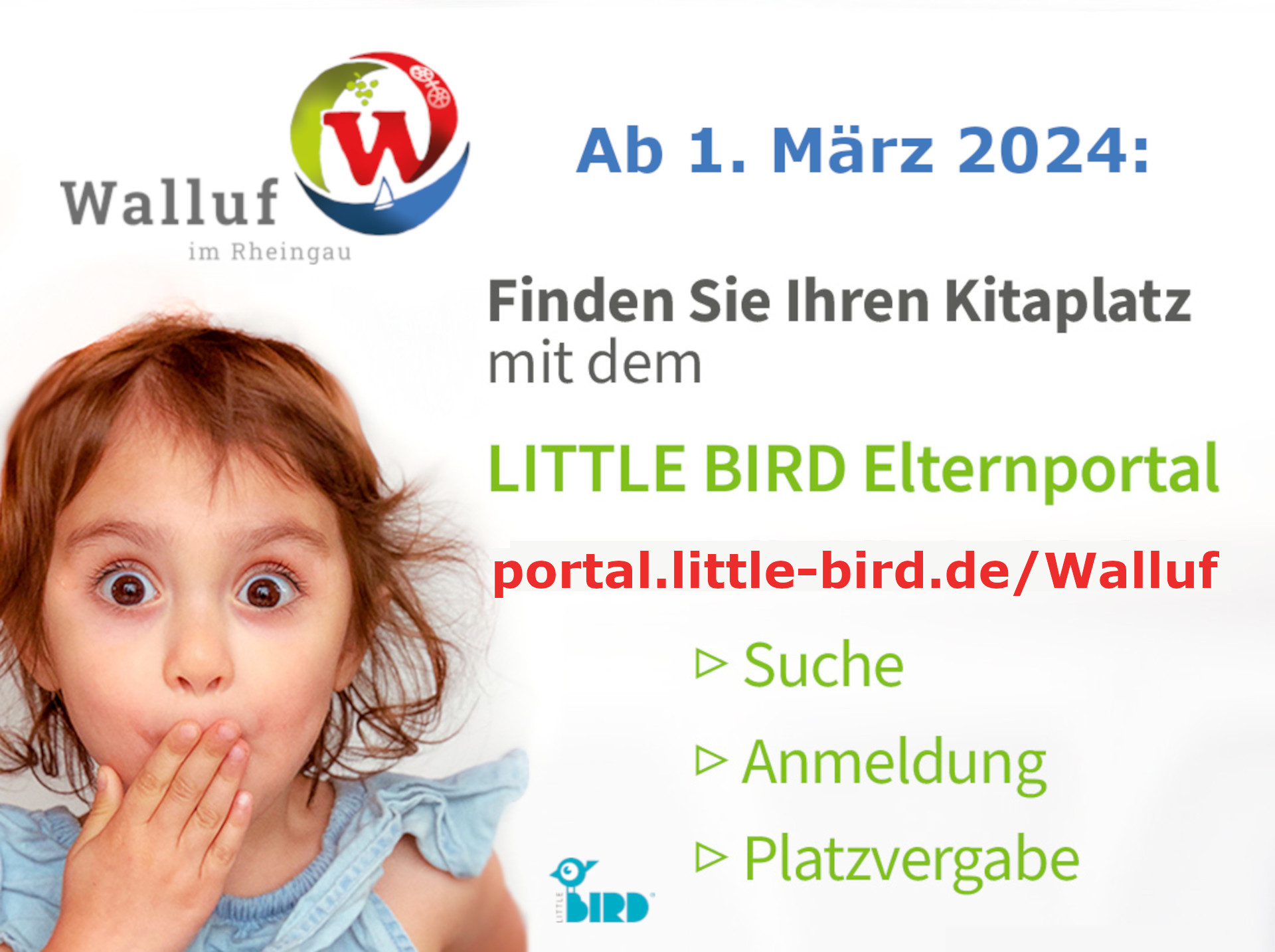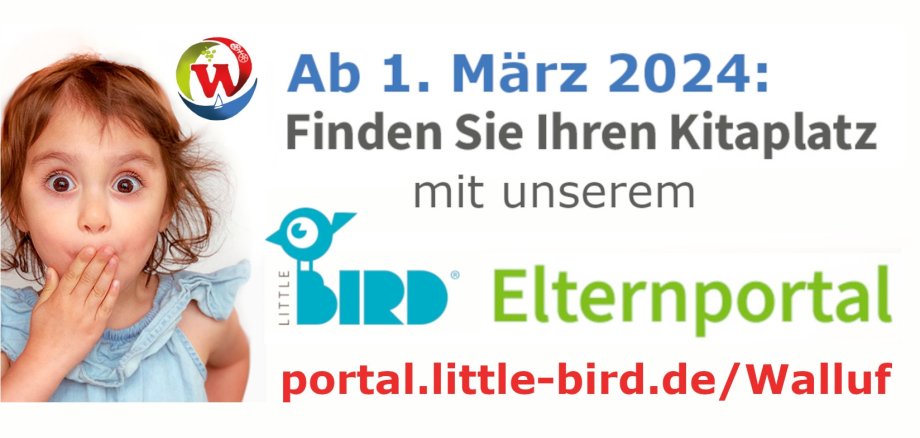 Weitere Informationen zu den Kindertagesstätten in Walluf, die Kitaplatzvergabe über „Little Bird“ sowie den direkten Link zum Elternportal gibt es auf www.walluf.de.