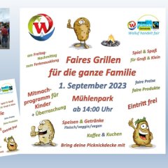 11) Die Gemeinde veranstaltete im September gemeinsam mit der Fair-Trade-Initiative zum zweiten Mal ein Faires Grillen. An diesem Tag hat sich wieder einmal gezeigt, wie gut die Zusammenarbeit zwischen Verwaltung, Feuerwehr und Vereinen bei uns funktioniert. Eigentlich sollte das mit viel Aufwand vorbereitete Familienfest im Mühlenpark stattfinden, jedoch war dieser wegen starker Regenfälle nicht zu begehen. Kurzerhand gelang es durch eine gemeinsame Kraftanstrengung, die Attraktionen vor dem Feuerwehrhaus aufzubauen. Mittags ließ dann auch der Regen nach und alle konnten den Nachmittag genießen.