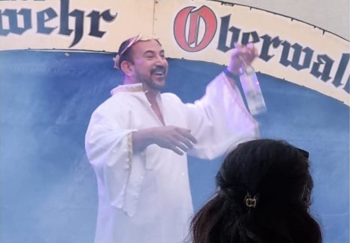 7) Am 18. Mai eröffnete die Feuerwehr Niederwalluf mit ihrem Tag der offenen Tür den Veranstaltungsreigen unserer Feuerwehren mit Feuerwehrfesten, Kameradschaftsabenden und Besuchen in Drobollach und Lechbruck am See. Das Feuerwehrfest in Oberwalluf im Juli hatte einem ganz besonderen Höhepunkt: Unser Bürgermeister löste seine Wettschuld aus dem Wahlkampf ein und besang als Bacchus den griechischen Wein: Und Niko - was macht Deine Schlagerkarriere?