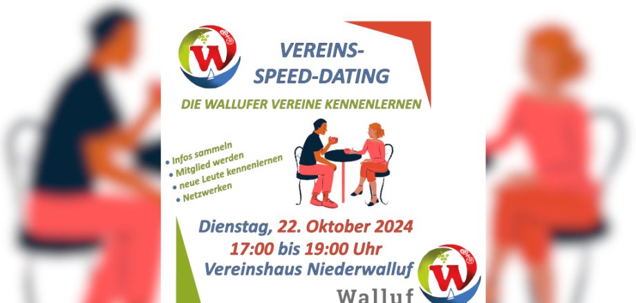 Insgesamt 16 Vereine und Organisationen präsentieren sich beim Wallufer Vereins-Speed-Dating am Dienstag, 22. Oktober 2024 von 17:00 bis 19:00 Uhr im Vereinshaus Niederwalluf. Jeder Teilnehmer an einem eigenen Tisch, an dem er für sich und sein Angebot werben und – wie beim klassischen Speed-Dating – mit dem Gegenüber, also den Besucherinnen und Besuchern, ins Gespräch kommen kann. „Wir freuen uns auf einen regen Austausch zwischen den Vereinen und der Wallufer Bevölkerung“, so Bürgermeister Stavridis weiter. „Und wer weiß, vielleicht findet ja der ein oder andere beim Speed-Dating seine ‚neue Liebe‘ und wird bei seinem Lieblingsverein gleich Mitglied. Zudem bietet das Speed-Dating auch eine gute Plattform zum Netzwerken der Vereine untereinander.“